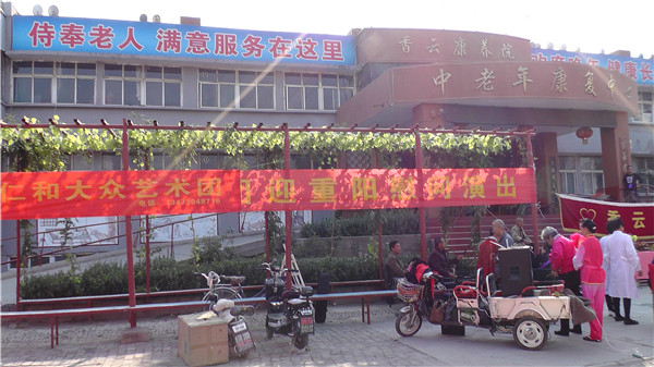 2018年10月11日下午2点,在重阳节到来之计,峰峰矿区仁和大众艺术团的演员们走进香云康养院,开展“欢度重阳节,情暖敬老院”的活动,弘扬中华民族尊老、敬老、爱老的传统美德,丰富老人们的精神文化生活。走进香云康养院,用爱心温暖老人,让老人感受家的温暖与温馨。老人们在欢声笑语中观看了演出,此次活动得到圆满成功